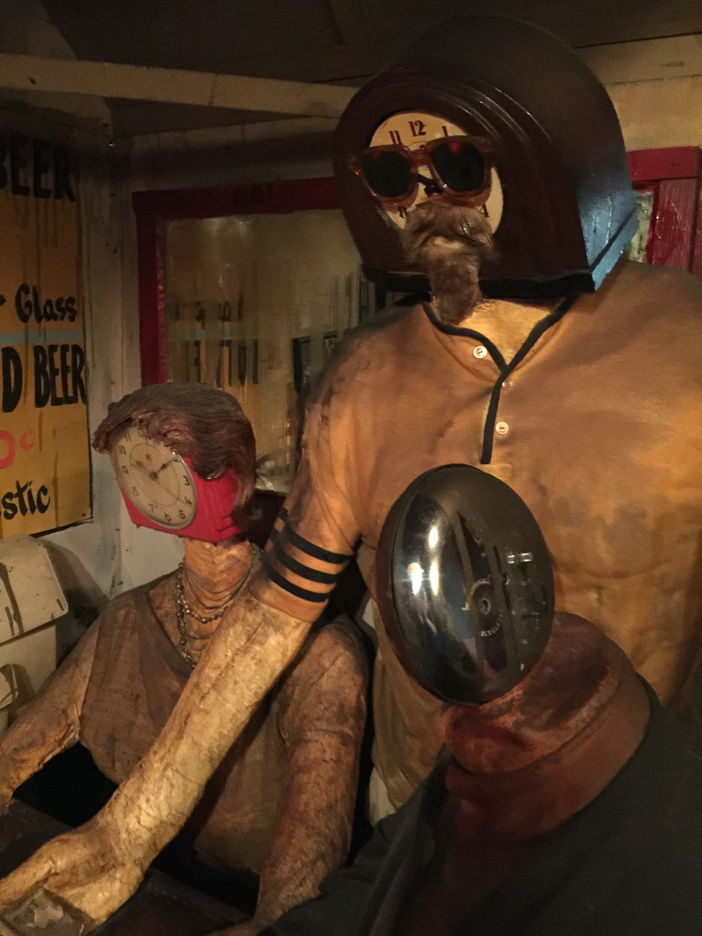 Beanery is defined as a cheap, usually inferior restaurant, and this one is modeled after the Barney's Beanery, a bar and restaurant in West Hollywood, Los Angeles. It was a famous hangout for artists, including the Kienholzes. Created in 1965, it first exhibited in the parking lot of the bar. Modeled at two-thirds the size of the original Beanery, it features the smells and sounds of the bar and models of customers, all of whom have clocks for faces with the time set at 10:10. Only the model of Barney, the owner, has a real face.
